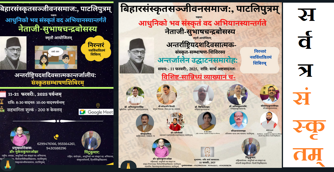सर्वत्र संस्कृतम्, विहार संस्कृत सञ्जीवन समाज पटना एवं पार्थ संस्कृत अकादमी दिल्ली के द्वारा आधुनिको भव संस्कृतं वद अभियान के अन्तर्गत नेताजी सुभाष चन्द्र बोस स्मृति अन्तर्जालीय दशदिवसात्मक अन्तर्राष्ट्रीय संस्कृत सम्भाषण शिविर का आयोजन 11- 21 फरवरी, 2025 को रात्रि 8:30 बजे से 10 बजे तक किया जा रहा है।